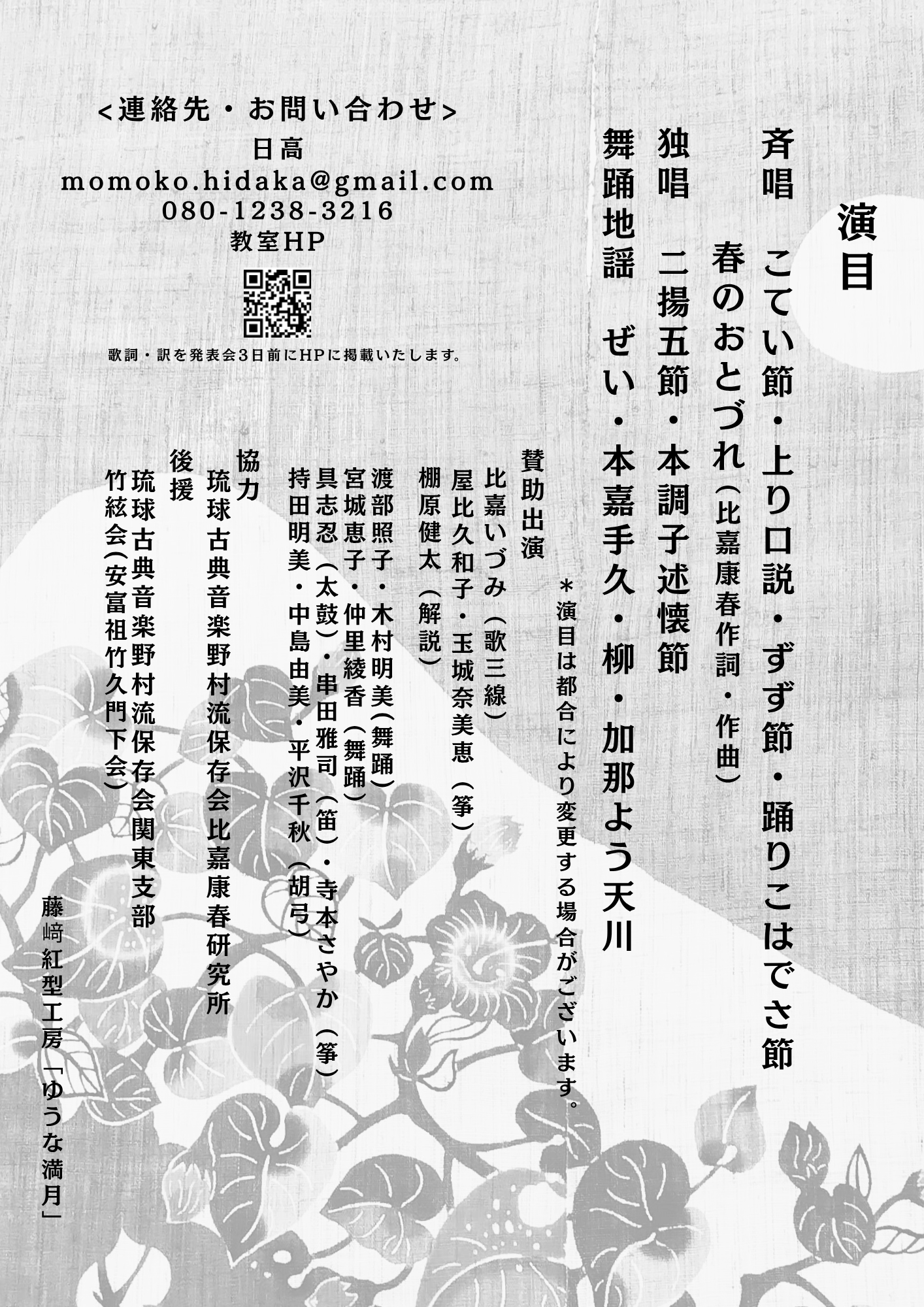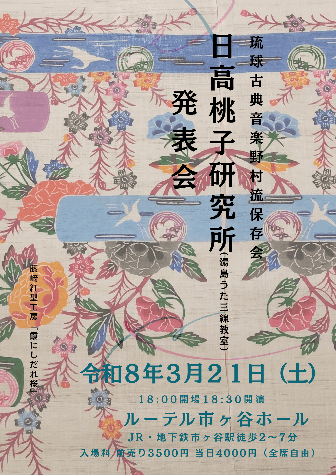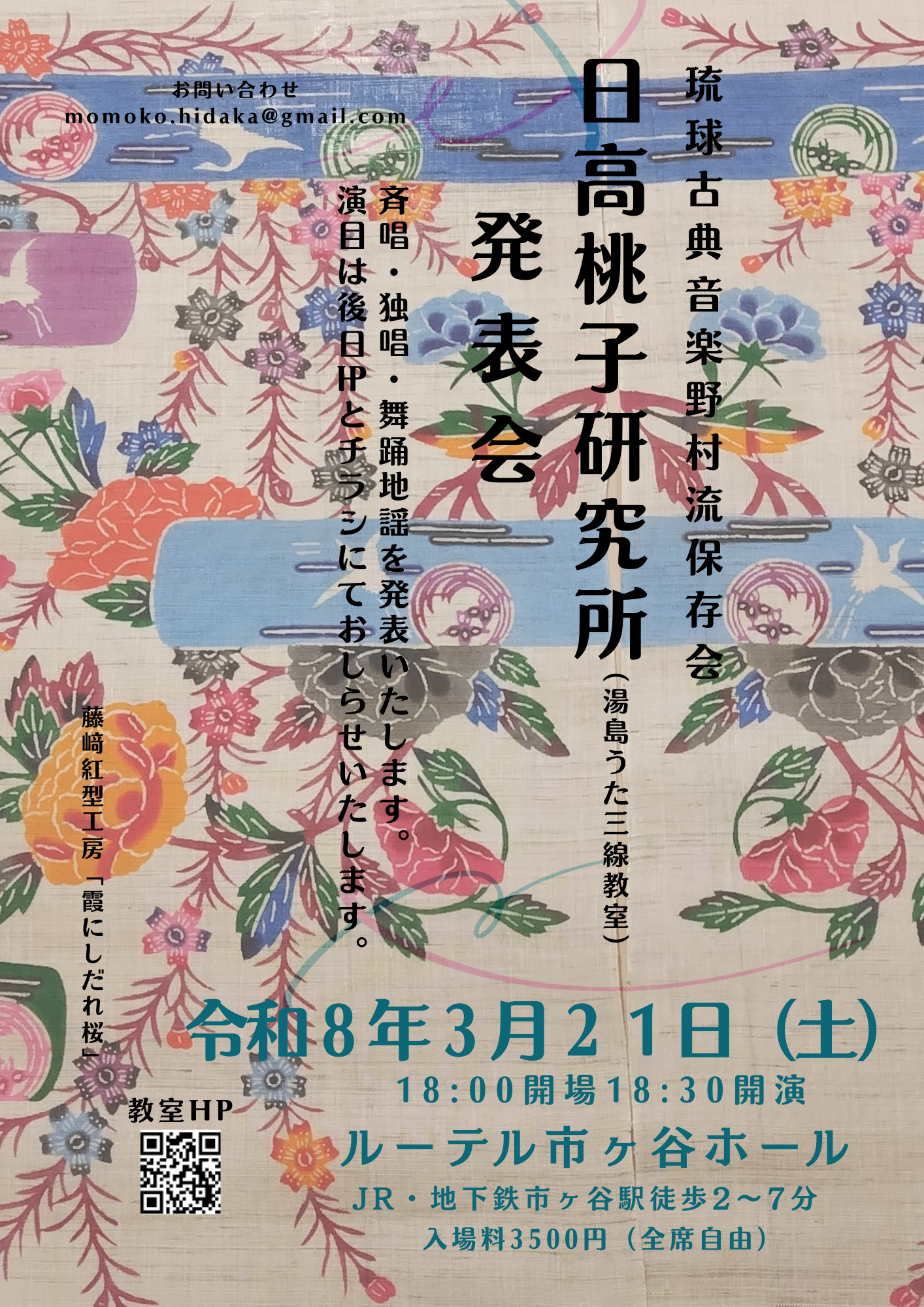 - 3/21に教室内温習会を実施、コンクール試演会や舞踊地謡の練習を行いました。また、琉球古典音楽野村流保存会関東支部45周年記念公演のお知らせを掲載しました。